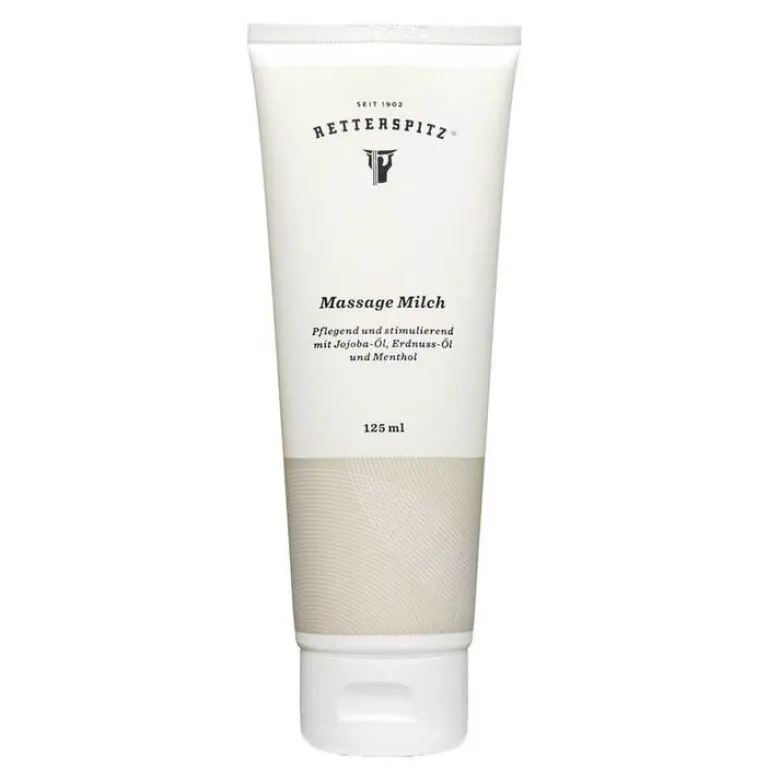Massage ist nicht gleich Massage: Mit der Retterspitz Massage Milch dringen stimulierende Inhaltsstoffe während des Massierens in die Hautschichten ein, erwärmen und lockern die Muskeln. Jojobaöl, Erdnussöl und Menthol stimulieren und erfrischen die Haut nach dem Baden, Duschen und der Sauna.