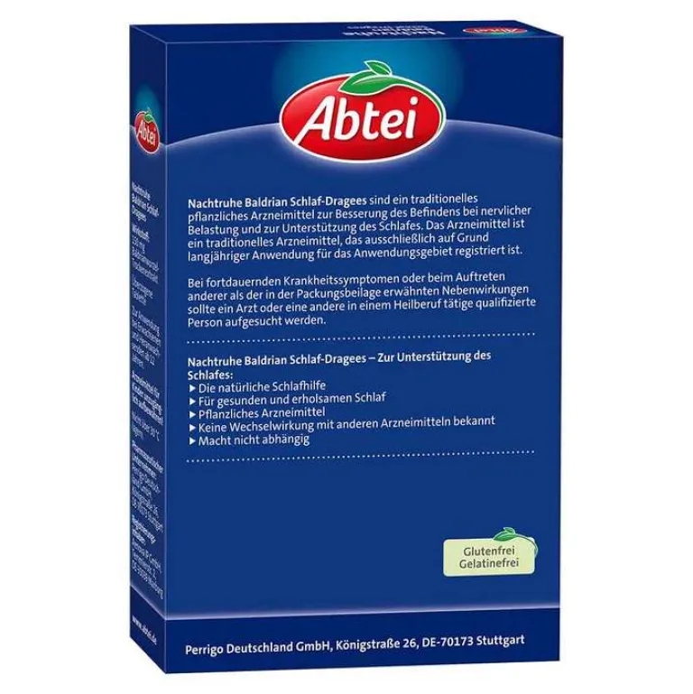 Abtei Nachtruhe Baldrian Schlaf-Dragees Anwendungsgebiete: Nachtruhe Baldrian Schlaf-Dragees sind ein traditionelles pflanzliches Arzneimittel zur Besserung des Befindens bei nervlicher Belastung und zur Unterstützung des Schlafes. Das Arzneimittel ist ein traditionelles Arzneimittel, das ausschließlich auf Grund langjähriger Anwendung für das Anwendungsgebiet registriert ist. Warnhinweise: Enthält Lactose und Sucrose (Zucker). Packungsbeilage beachten. Zu Risiken und Nebenwirkungen lesen Sie die Packungsbeilage und fragen Sie Ihre Ärztin, Ihren Arzt oder in Ihrer Apotheke.