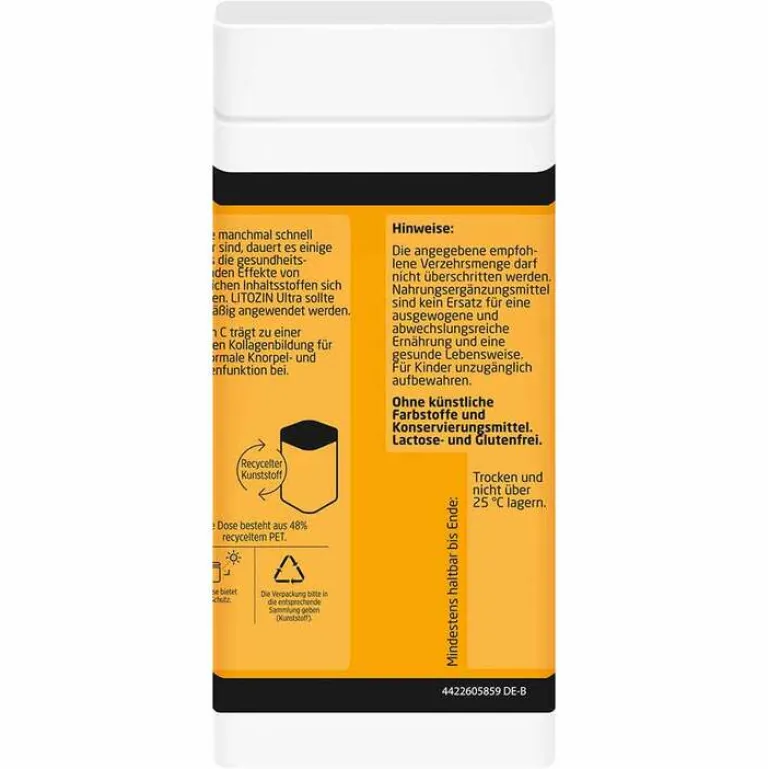 Durch das besondere Herstellungsverfahren enthält Litozin einen hohen Anteil an wertvollen Pflanzenstoffen. Das in Litozin enthaltene Vitamin C trägt zu einer normalen Kollagenbildung für eine normale Knorpelfunktion bei.*