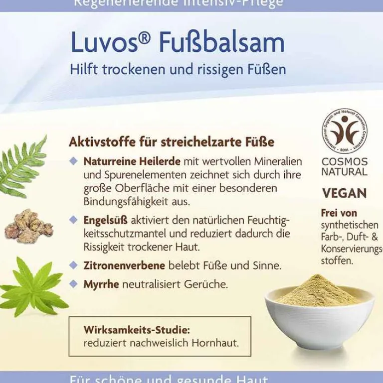 Zertifizierte Naturkosmetik hergestellt in Deutschland: das Familienunternehmen Luvos mit 100-jähriger Tradition stellt dieses Produkt nach höchstem Standard von COSMOS NATURAL / BDIH her. Es ist selbstverständlich vegan, tierversuchsfrei. Die Hautverträglichkeit ist dermatologisch bestätigt. Der Fußbalsam ist vollkommen frei von problematischen Zusatzstoffen wie Mikroplastik, Mineralöl, Parabenen, Silikonen, Paraffinen, PEGs, künstlichen Farb-, Duft- und Konservierungsstoffen.