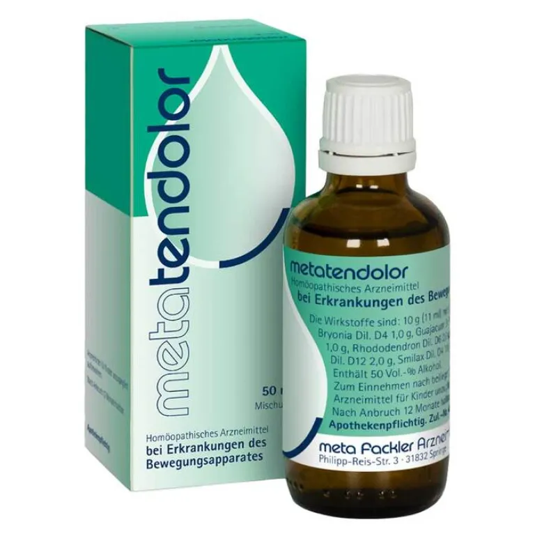 metatendolor Mischung.Die Anwendungsgebiete leiten sich von den homöopathischen Arzneimittelbildern ab. Dazu gehört: Rheumatismus. Hinweis: Bei akuten Zuständen, die z. B. mit Rötung, Schwellung oder Überwärmung von Gelenken einhergehen, sowie andauernden Beschwerden sollte ein Arzt aufgesucht werden. Enthält 51 mg Alkohol (Ethanol) pro 5 Tropfen, entsprechend 50 Vol.-%. Zu Risiken und Nebenwirkungen lesen Sie die Packungsbeilage und fragen Sie Ihre Ärztin, Ihren Arzt oder in Ihrer Apotheke. meta Fackler Arzneimittel GmbH, D-31832 Springe.