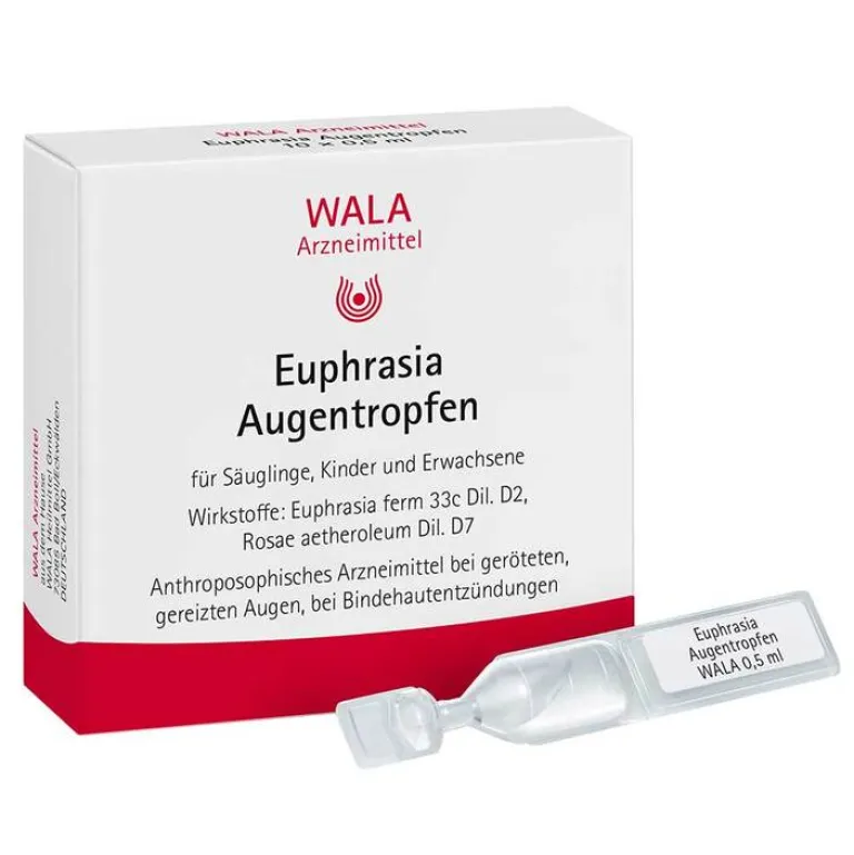 Die Euphrasia Augentropfen von Wala dienen der Behandlung von Entzündungen und Reizungen im Bereich des Auges im Rahmen einer Erkältung. Die Bindehautentzündung, auch Konjunktivitis genannt, zählt zu den klassischen Anwendungsgebieten. Der Name des Arzneimittels geht auf die Pflanze Euphrasia zurück. Dabei handelt es sich um eine Wiesenpflanze aus der Familie der Sommerwurzgewächse, die auch Gemeiner Augentrost genannt wird.